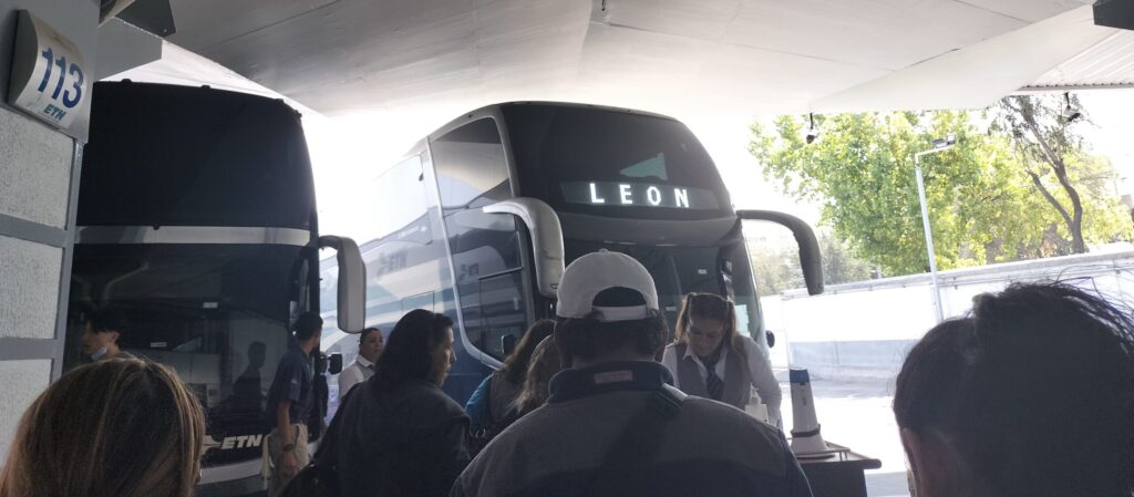 途中で相方さんが行き先が違うと言われます。グアナファト行きを予約したと思って何も気づかずバスに乗り込みましたが、なんと「LEON レオン」行きでした!