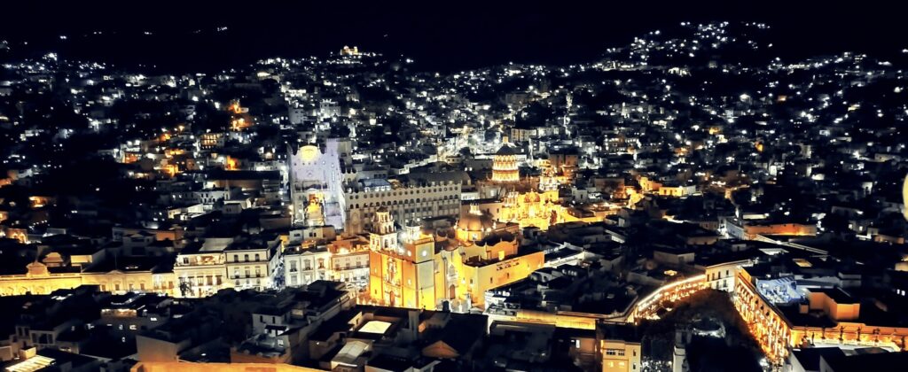 頂上到着後、少し歩くと銅像のある広場に出ます。よくWEBでみるグアナファトの夜景!ここを目指してきた私としては感無量、キラキラした夜でした。