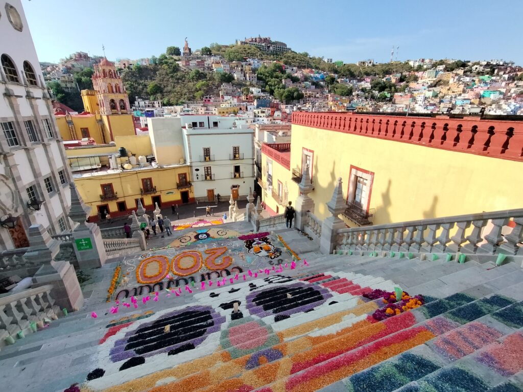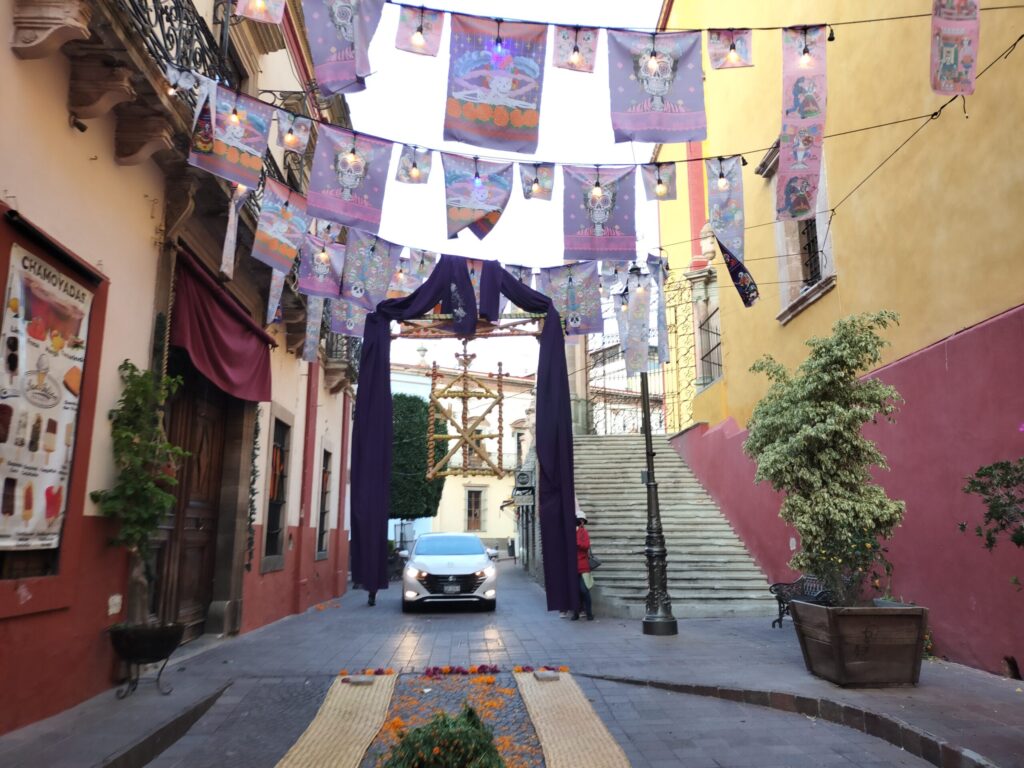 そこから歩きで下山します。30分くらいでしょうか。ちょっと急でアスファルトもまばらな道で足元には要注意でした。景色と街並みを楽しみながら朝のお散歩。死者の日の飾りもたくさん出ていました!